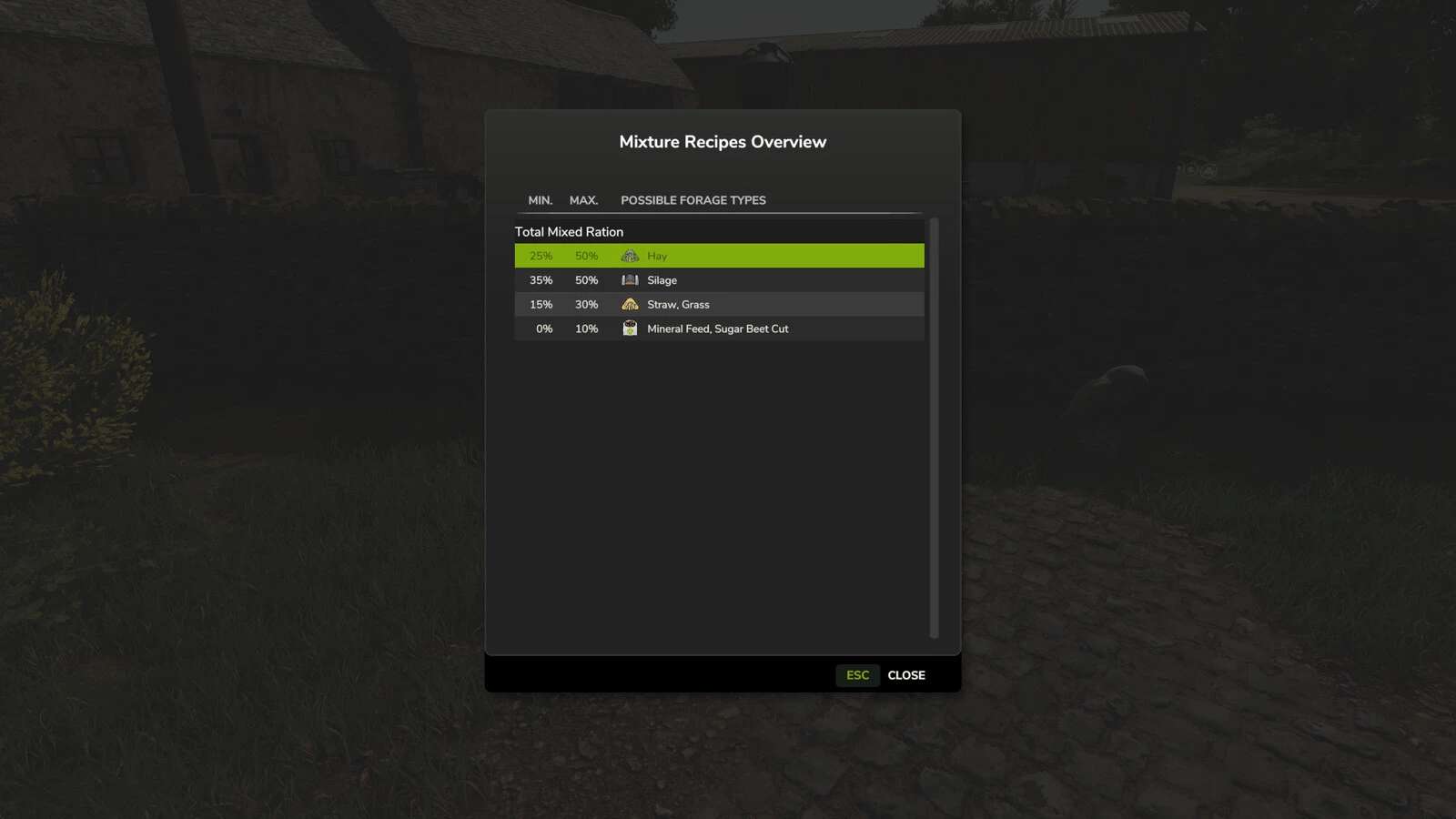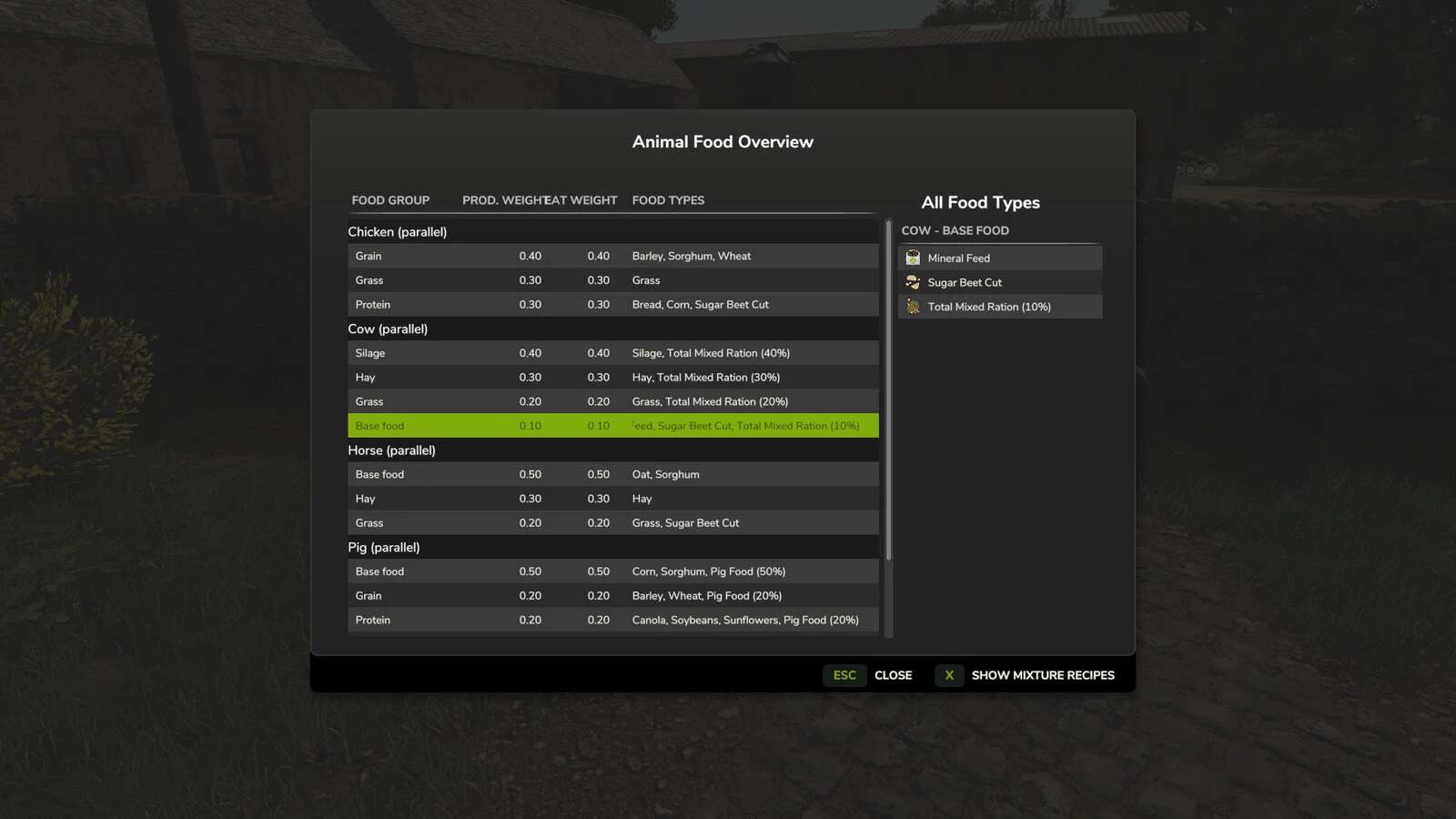 Liczby dotyczące żywności i produkcji (wartości wejściowe i wyjściowe w litrach) są wartościami bazowymi gry, a modyfikacja nie jest możliwa za pomocą tego moda!