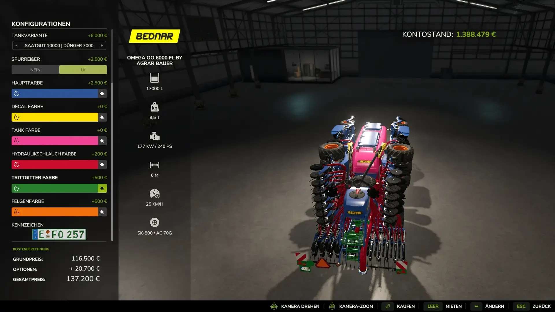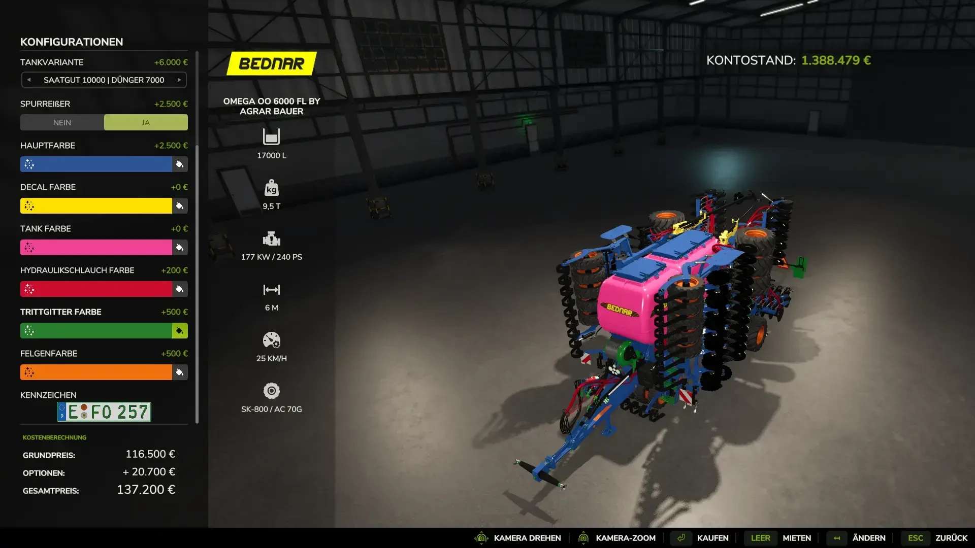 Brednar Omega6000FL w kolorze wielokolorowym. Siewnik może siać wszystkie uprawy dostępne w LS25.