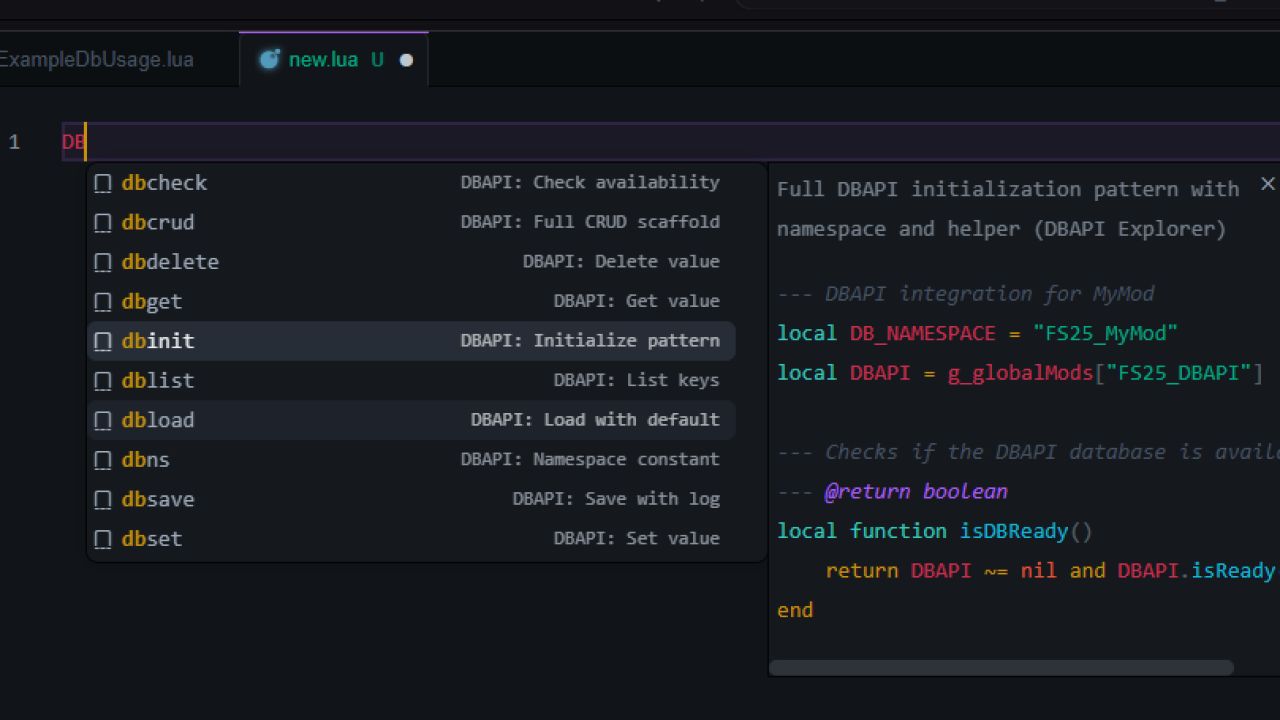 FS25_DBAPI to uproszczona warstwa trwałości dla modów do Farming Simulator 25. Zastępuje ona przetwarzanie danych fragmentarycznych scentralizowaną, opartą na JSON bazą FlatDB i udostępnia proste globalne API (g_globalMods["FS25_DBAPI"].DBAPI) do przechowywania kluczy/wartości w przestrzeni nazw.