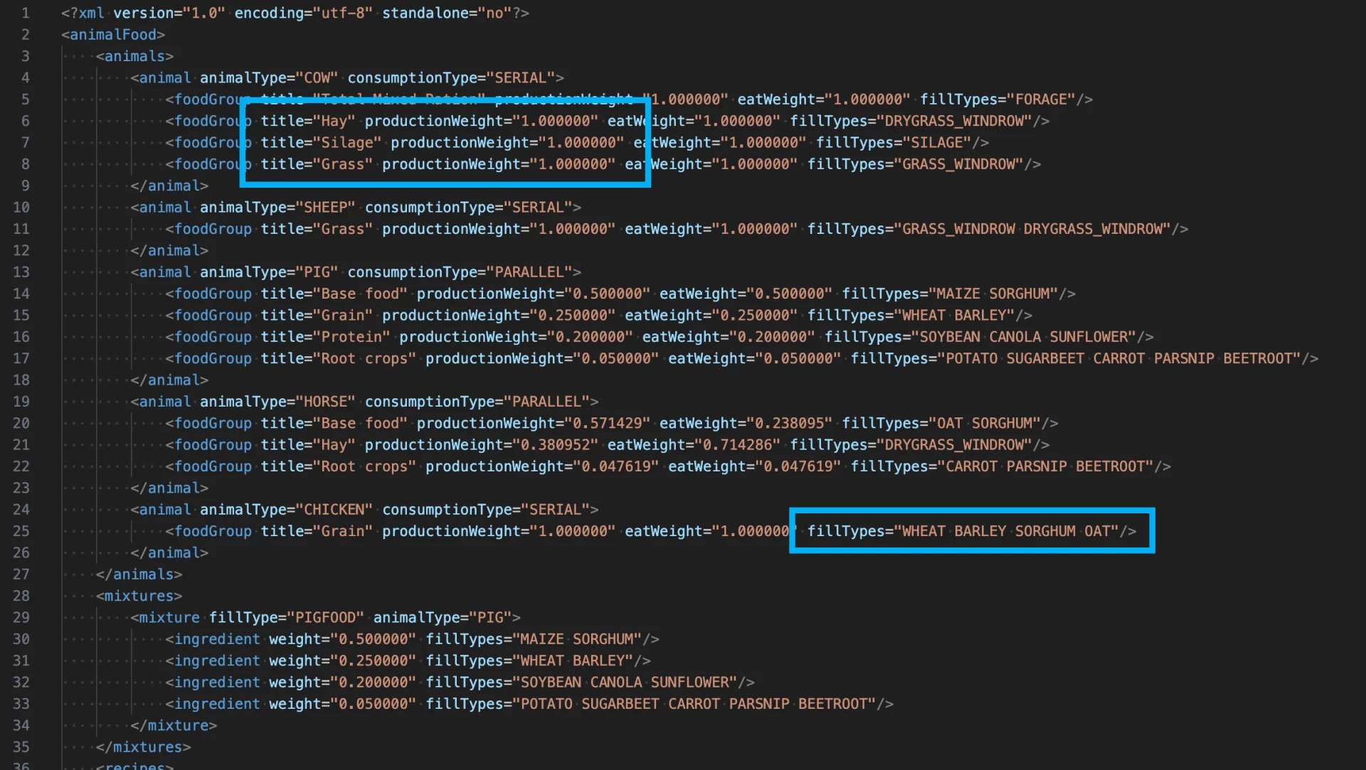 Konfiguracja z weryfikacją schematu: Używa wbudowanego schematu AnimalFoodSystem w grze, aby zapewnić solidną obsługę XML z kontrolą błędów