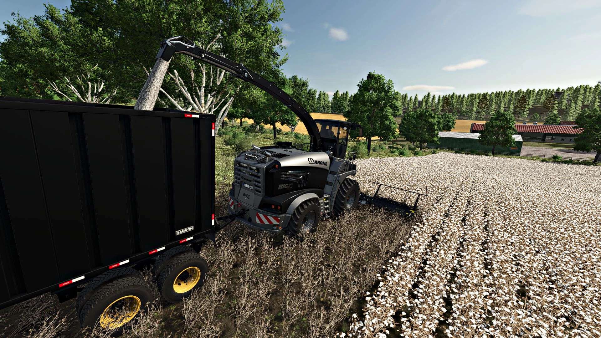 Zestaw do czyszczenia bawełny, w skład którego wchodzi zmodernizowany kombajn paszowy Krone BIG X 1180, żniwiarka X-Collect 900-3 oraz dwie przestronne przyczepy: Randon Canavieiro i Krampe SB II 30/1070. Idealny do zbioru i transportu luźnej bawełny.