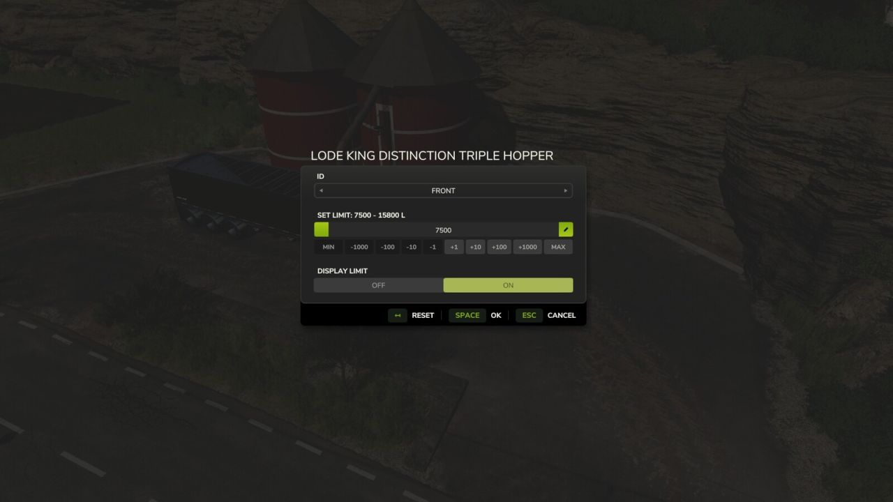 Użytkownik może następnie ustawić maksymalny limit napełnienia, przy którym przyczepa ma się zatrzymać. Bardzo przydatne, jeśli chcesz zebrać tylko określoną ilość z silosu lub punktu zakupu. Limity są zapisywane dla każdego pojazdu i można je zresetować w dowolnym momencie w GUI.
