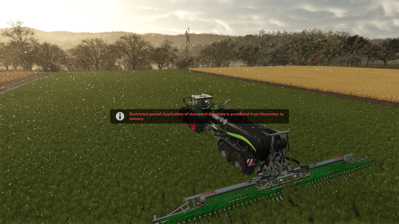 Jeśli gracz spróbuje uruchomić wóz asenizacyjny lub rozrzutnik obornika w czasie obowiązywania ograniczeń, akcja zostanie zablokowana, a na ekranie pojawi się komunikat ostrzegawczy (np. „Okres obowiązywania ograniczeń!” lub „Przymrozek!”).