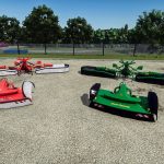 W tym zestawie znajdują się trzy modele kosiarek marki Kuhn. Dwa z nich są również dostępne w wersji inspirowanej marką John Deere.