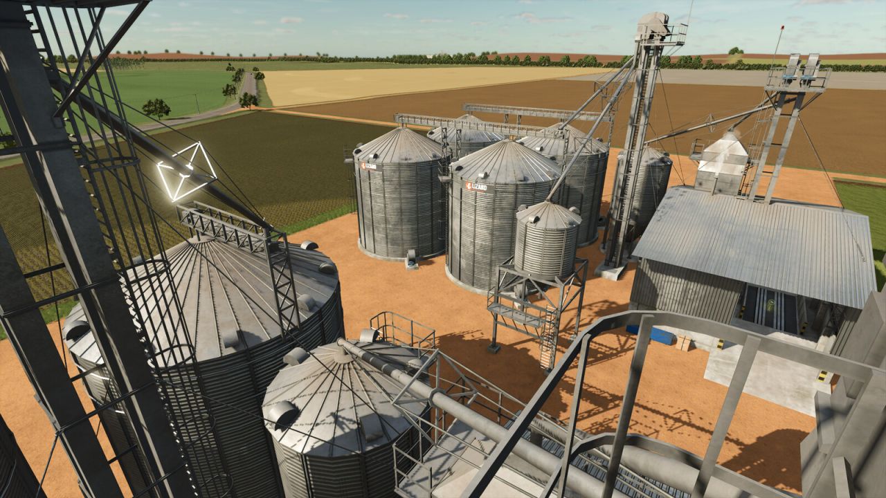Pakiet z dwoma średniej wielkości silosami, każdy o innej pojemności, idealny do przechowywania produktów. Ściany stodoły można dostosować do indywidualnych potrzeb, z opcją odsłoniętej cegły lub okładziny betonowej. Kolor betonu można zmienić, tak jak w przypadku stodół w grze.