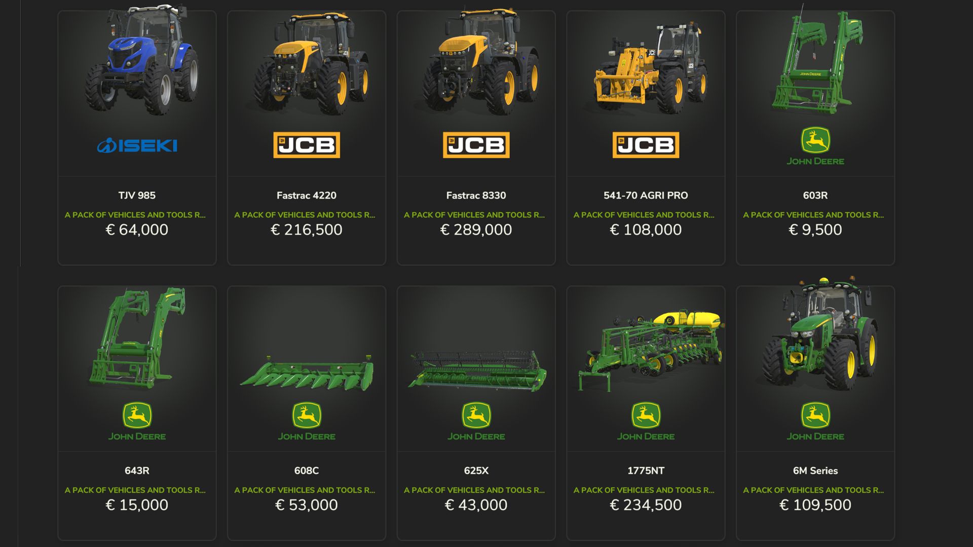 JohnDeere – ładowacz czołowy 603R, ładowacz czołowy 643R, heder 608C, heder 625X, sadzarka 1775NT