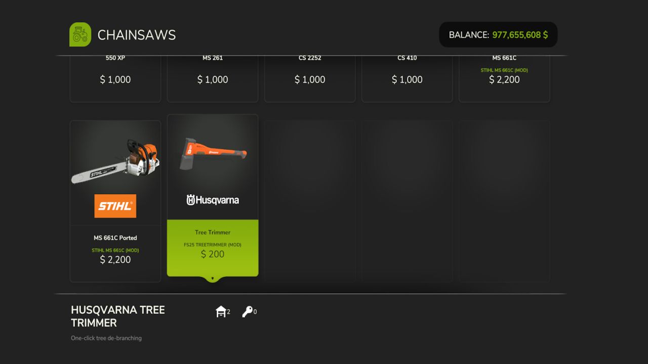 Dodaje dostępną do kupienia siekierę, która natychmiast usuwa widoczne gałęzie powalonego drzewa.