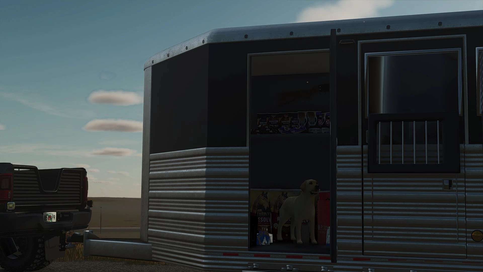 Podwójne drzwi do trenażera bocznego, zintegrowany pojemnik na siano, duża przednia garderoba ze schowkiem na buty, półkami i drążkiem na ubrania
