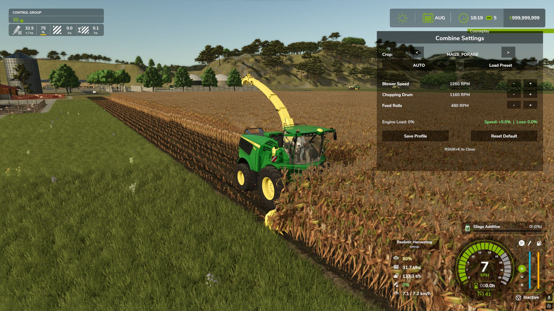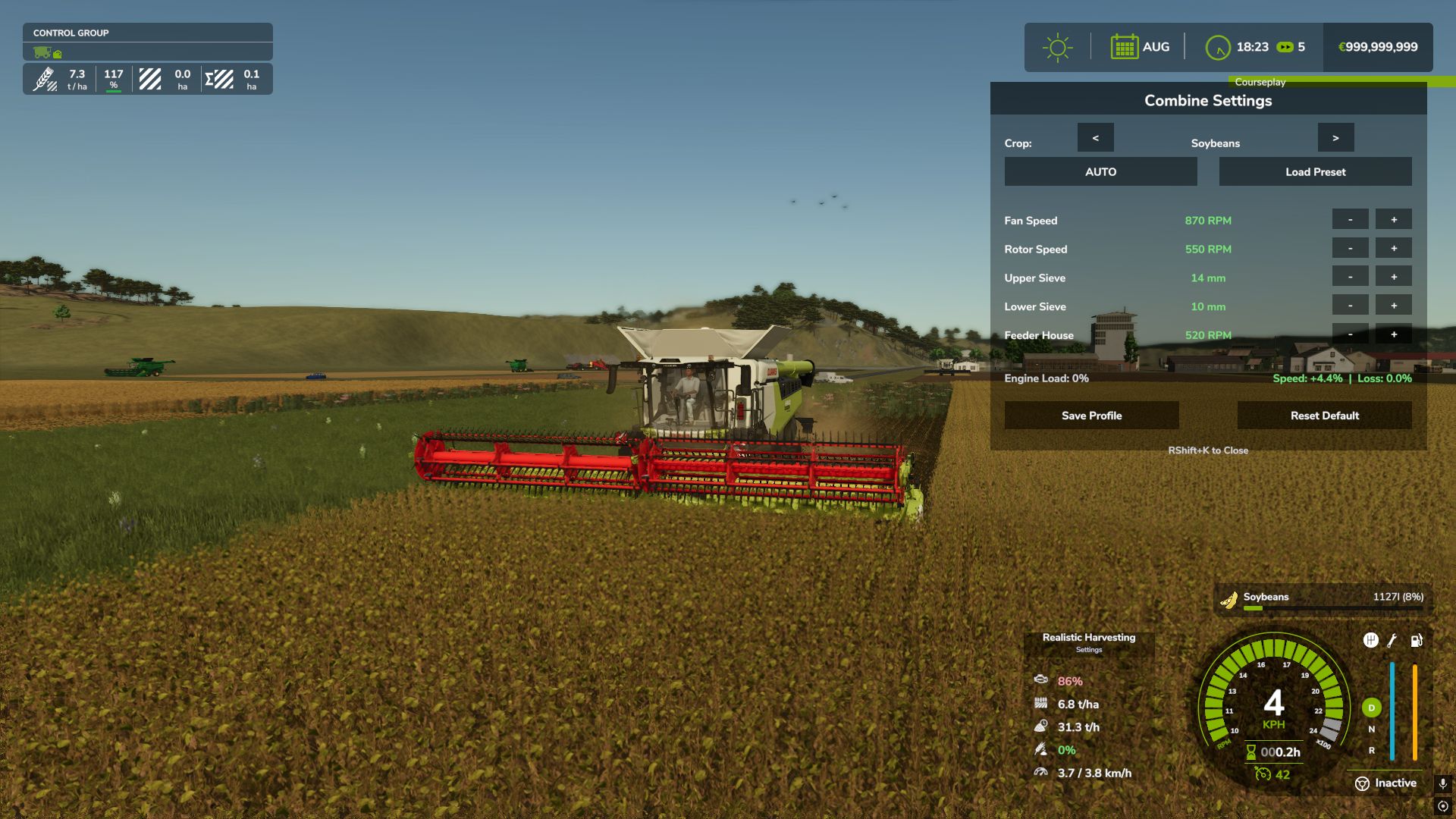 ⚙️ Interaktywna kalibracja kombajnu (NOWOŚĆ): Naciśnij `RShift + K`, aby otworzyć menu ustawień kombajnu! Musisz skalibrować wentylator, wirnik, sita i podajnik dla każdego konkretnego rodzaju plonu. Nieprawidłowe ustawienia spowodują dodatkowe straty plonu!