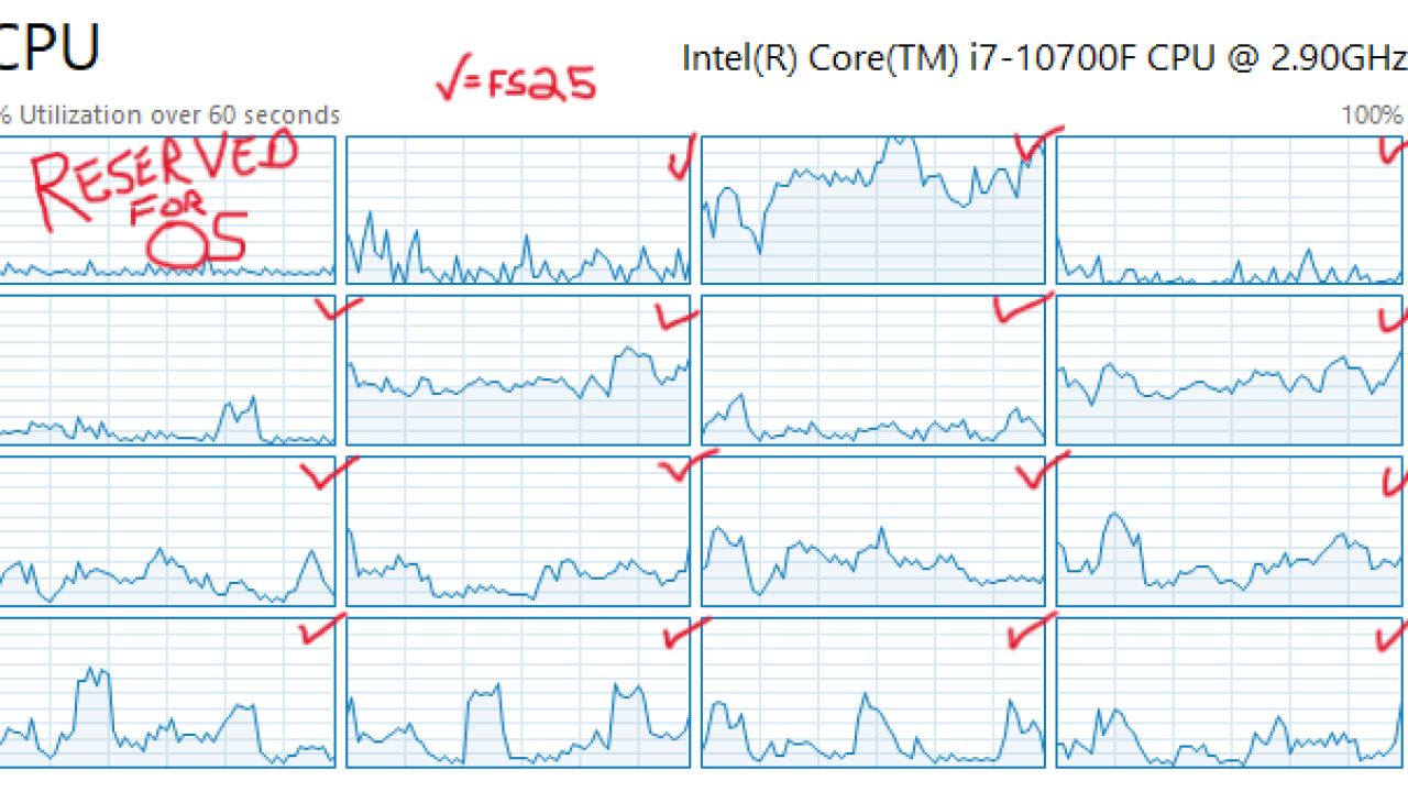 W moim procesorze i7-10700F mam 16 rdzeni. Miałem już dość tego, że FS25 niszczył tylko jeden z nich, a drugi w niewielkim stopniu. Dopóki nie zacząłem dokładnie monitorować obciążeń, nie zdawałem sobie sprawy, jak bardzo ten silnik blokuje rdzeń procesora. Chociaż można zaobserwować „ogólne” obciążenie procesora na poziomie zaledwie 50%, to rzeczywiste obciążenie poszczególnych rdzeni przedstawia zupełnie inny obraz.